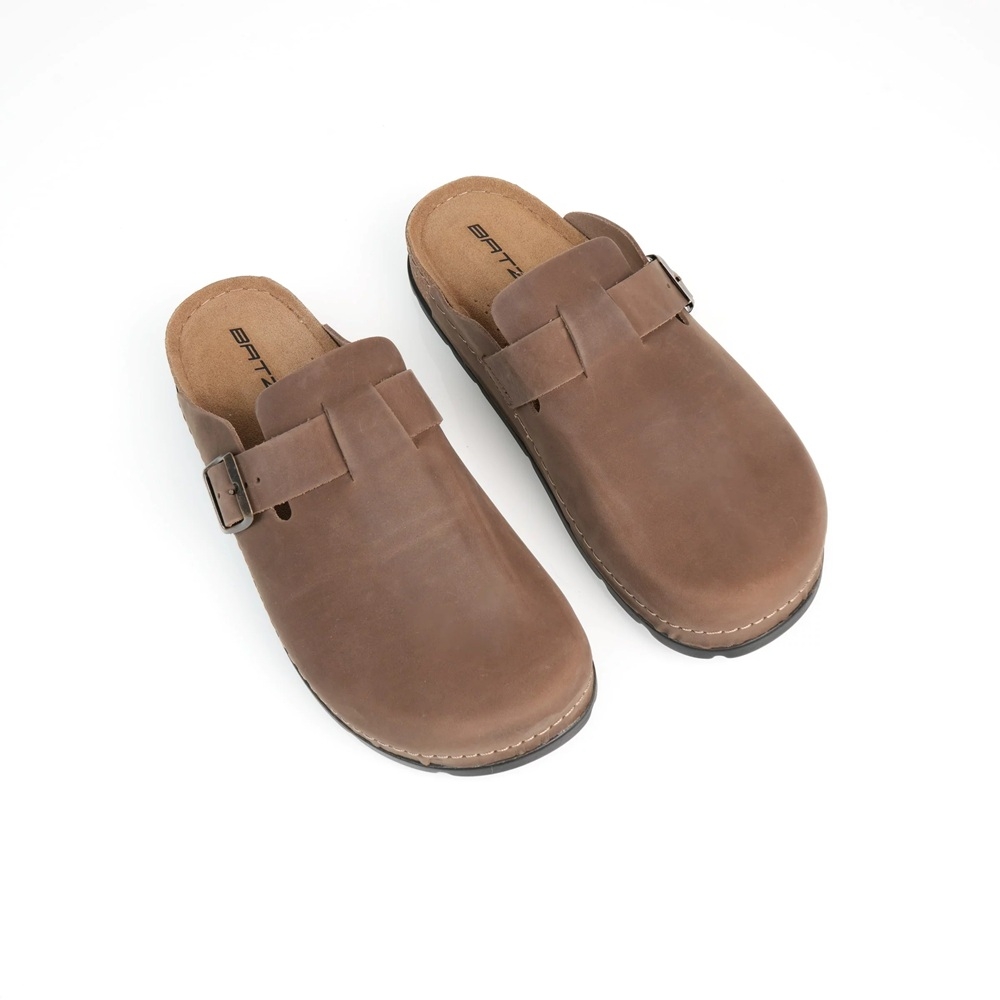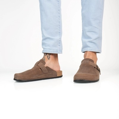 A barna színű, zsíros marhabőr felsőrész elegáns megjelenést és időtálló minőséget képvisel. Az állítható pánt révén könnyedén személyre szabható, így tökéletesen illeszkedik a láb formájához.