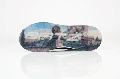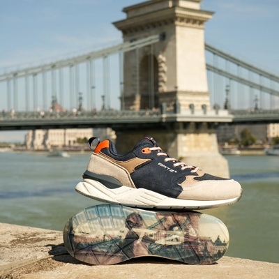 A sötétkék, szürke, barna és téglaszín harmonikus kombinációja a város karakterét idézi, míg az átlátszó talpban a Lánchíd tükröződik – Budapest egyik ikonikus csodája szó szerint a talpad alatt.