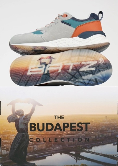A szürke, kék és narancssárga harmonikus kombinációja a város karakterét idézi, míg az átlátszó talpban az Szabadság-szobor tükröződik – Budapest egyik ikonikus csodája szó szerint a talpad alatt.