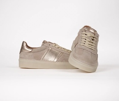A bézs színű Delila sneaker egy letisztult, kényelmes darab. Hasított bőr felsőrészét csillogó részletekkel láttuk el, így könnyen kombinálható nőies és sportos összeállítással egyaránt. Könnyű és rugalmas kialakításának köszönhetően maximális kényelmet nyújt, miközben divatos megjelenést kölcsönöz. A cserélhető talpbetétnek köszönhetően akár saját egyedi stílusodnak megfelelően is alakíthatod a kényelmet – egyedi talpbetét választásával.