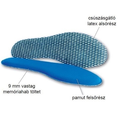 Memóriahabos talpbetét pamut felsőrésszel és csúszásgátló, latex alsórésszel. A talpbetét 9 mm vastag emlékező hab középréteggel rendelkezik, mely felveszi a láb formáját és kellemes puha érzetet biztosít, miközben pihenteti a fáradt lábakat. Kipárnázza a talp azon részeit, melyekre járás közben erősebb nyomás terhelődik.